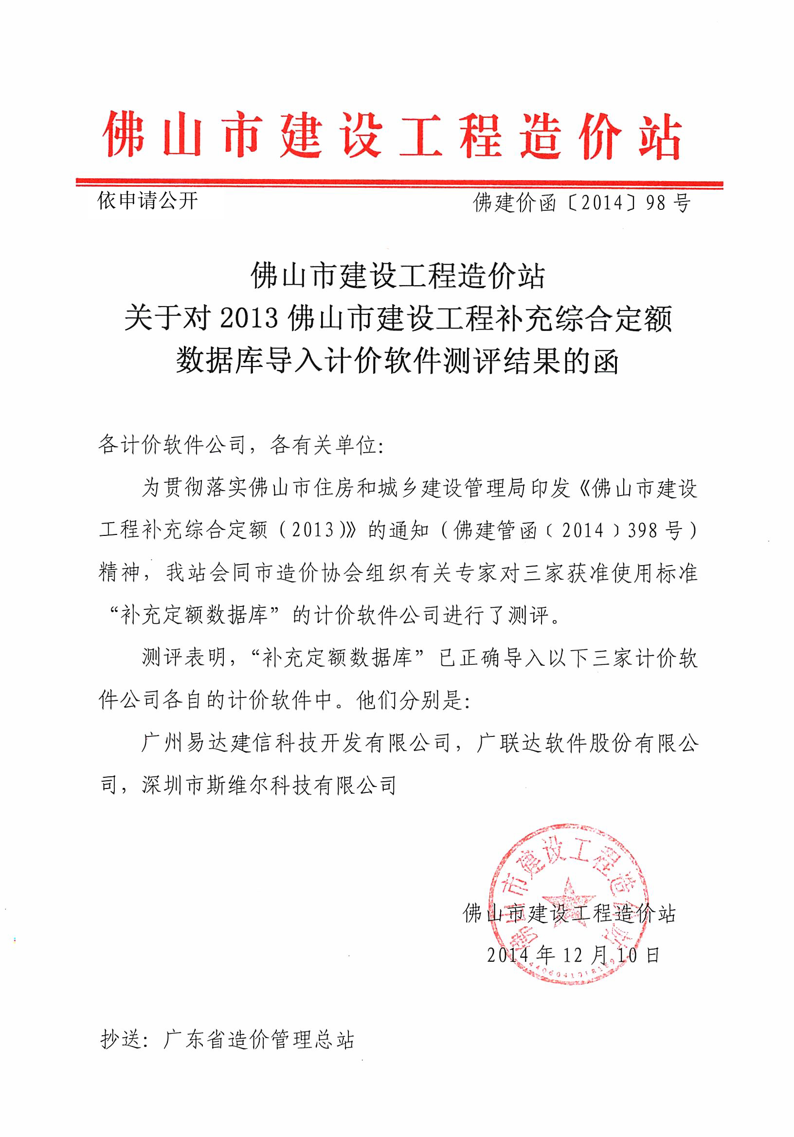 佛山市建設工程造價站關于對2013佛山市建設工程補充綜合定額數據庫存導入計價軟件測評結果的函