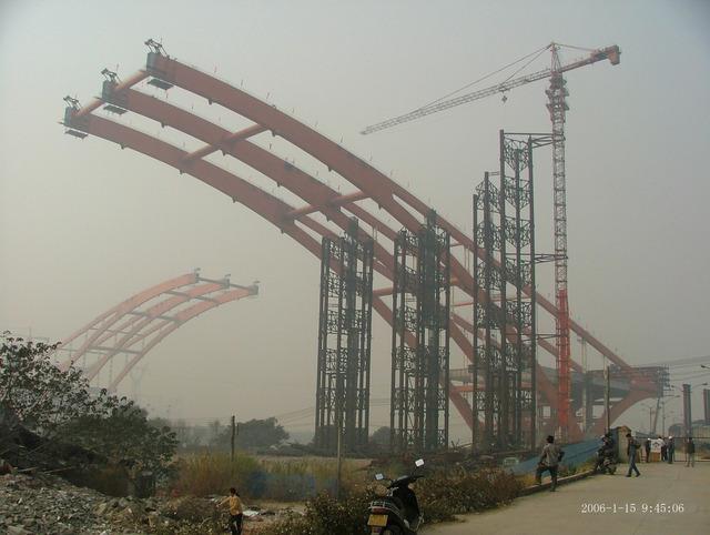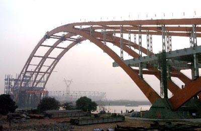 昨日上午,近百名工程人員在南岸現(xiàn)場(chǎng)進(jìn)行試轉(zhuǎn)前的最后檢查。10時(shí)30分,完成了牽引力加載后,項(xiàng)目負(fù)責(zé)人發(fā)布了南岸拱肋的試轉(zhuǎn)指令。至下午3時(shí),南岸重達(dá)1.48萬(wàn)噸的拱肋一共轉(zhuǎn)動(dòng)了90度。由于是初次平轉(zhuǎn),為了慎重起見(jiàn),原計(jì)劃平轉(zhuǎn)過(guò)程需要20多個(gè)小時(shí),但實(shí)際上只用了4個(gè)多小時(shí),平轉(zhuǎn)時(shí)間大為縮短。
