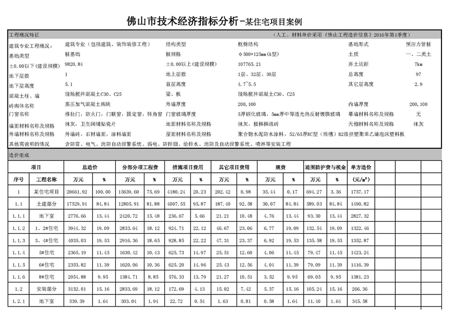 佛山市2016年第2季度技術經濟指標分析—某住宅項目案例