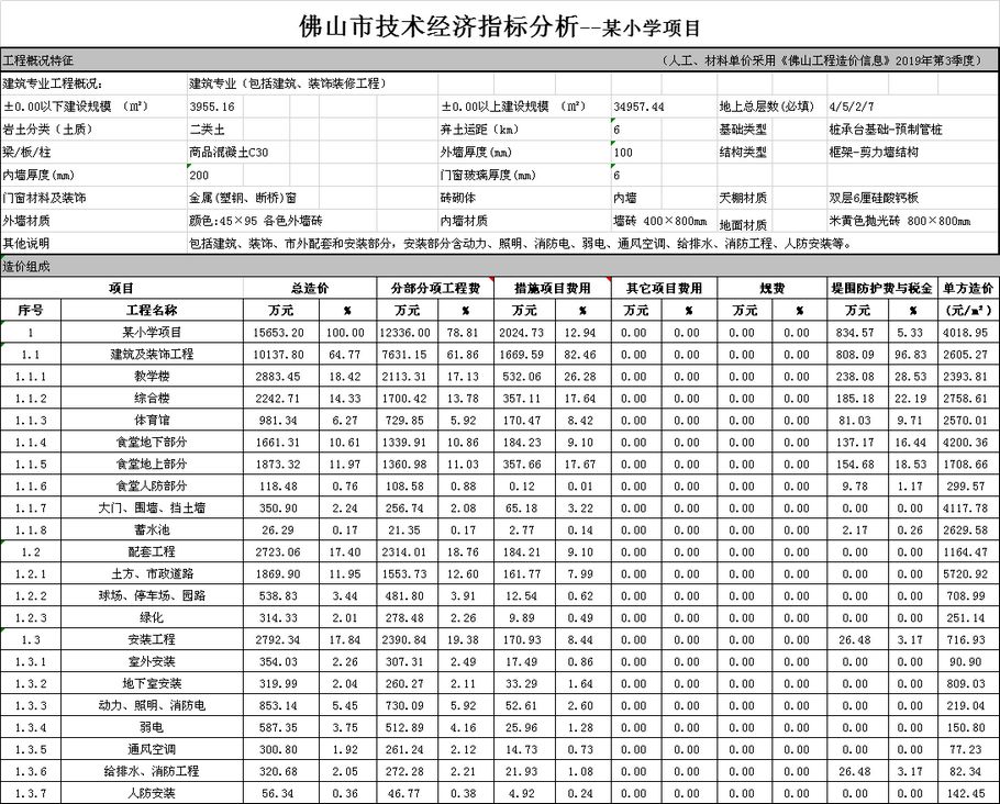佛山市2019年第4季度技術(shù)經(jīng)濟(jì)指標(biāo)分析—某小學(xué)項目
