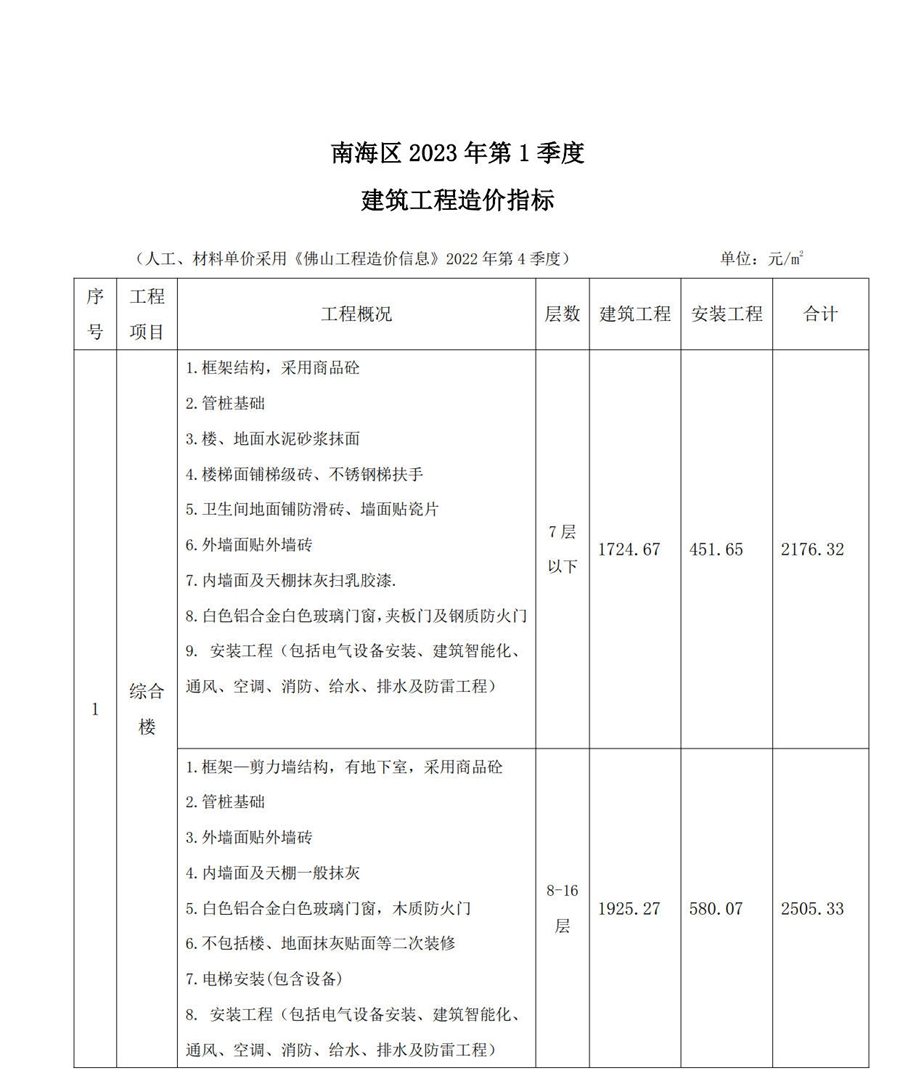 南海區(qū)2023年第1季度建筑工程造價指標