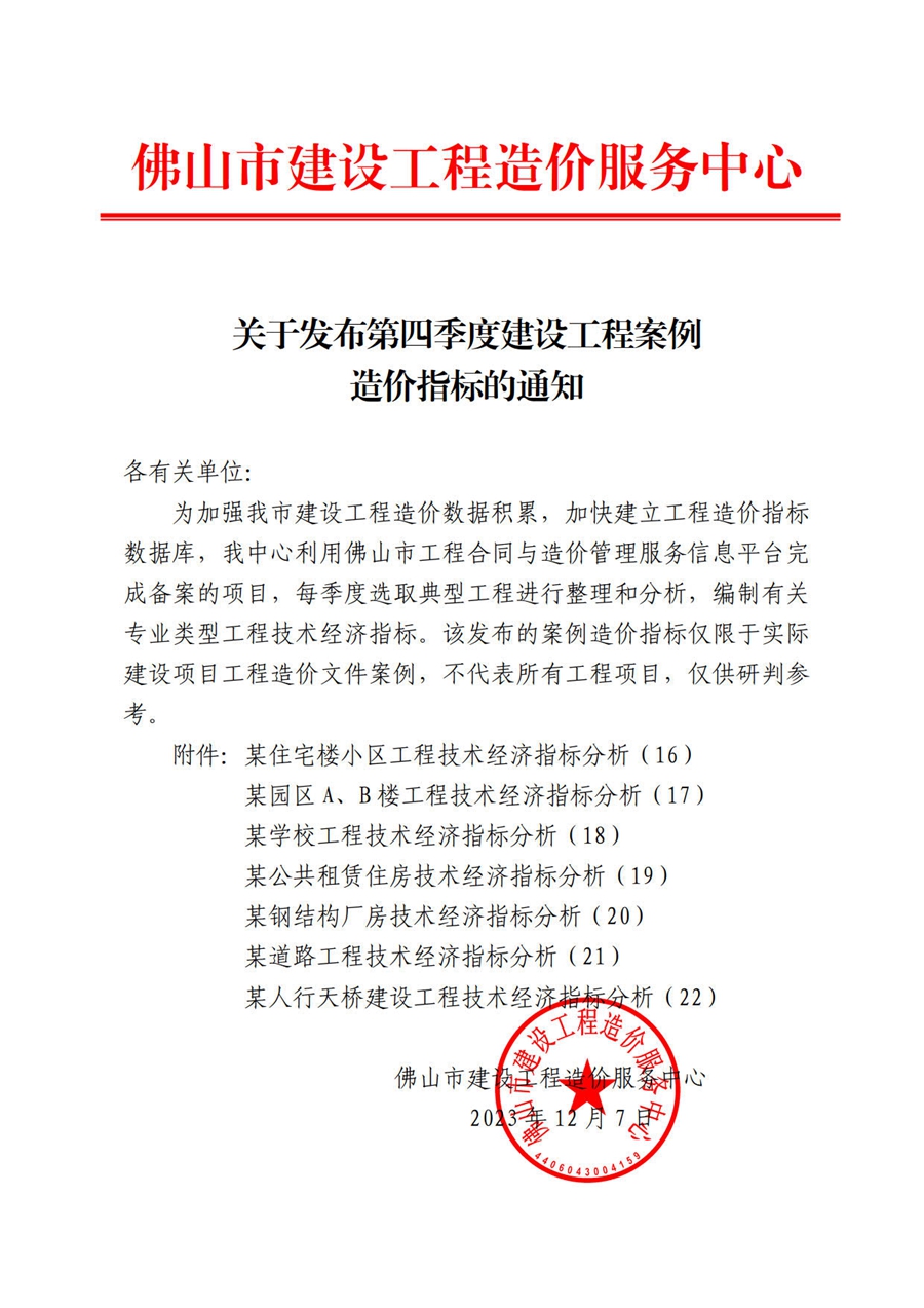 關(guān)于發(fā)布第四季度建設(shè)工程案例造價(jià)指標(biāo)的通知