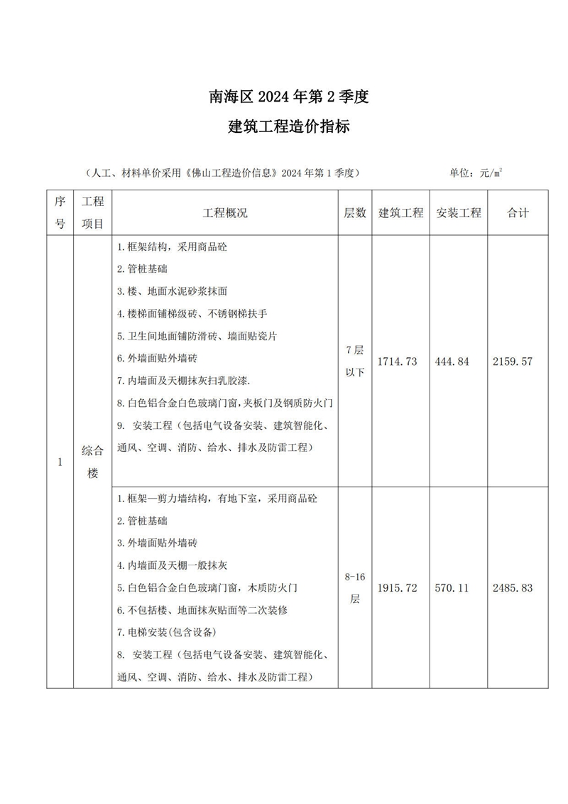 南海區(qū)2024年第2季度建筑工程造價指標(biāo)