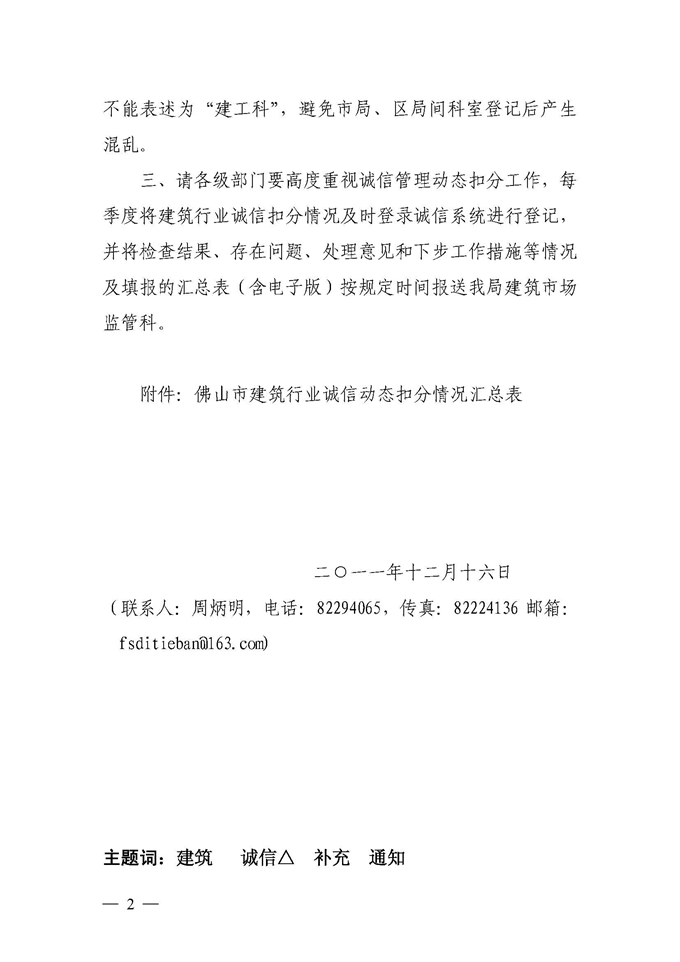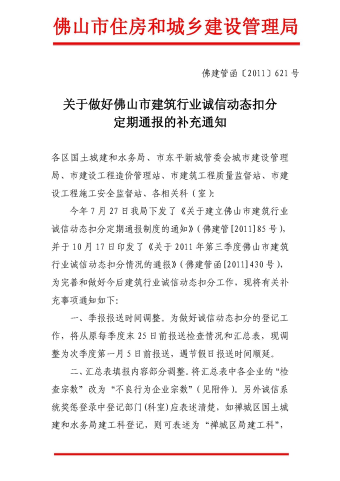 關于做好佛山市建筑行業誠信動態扣分定期通報的補充通知