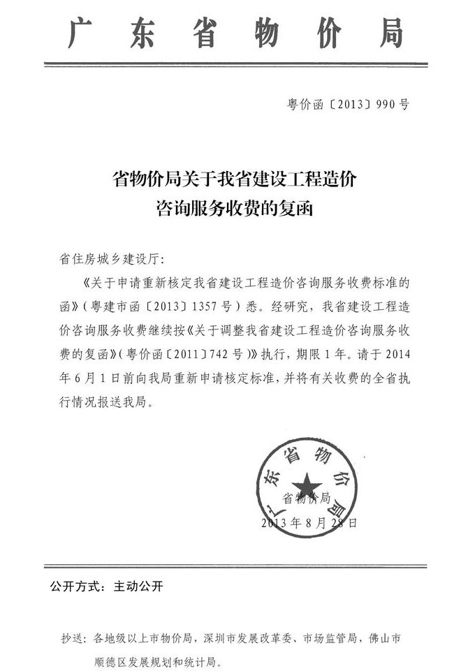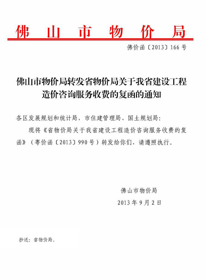 佛山市物價局轉(zhuǎn)發(fā)省物價局關于我省建設工程造價咨詢服務收費的復函的通知